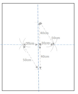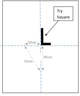 Pick the opposite walls where the length of the walls is the closest, and use the chalk line from the centre of those walls to be your starting point. Now that we know the centre point of that line ( from the step above ) measure back up that line 40cm on each side of the centre point. From each of these points 40cm off centre, measure out 50cm and mark a small curve at 50cm from each of these points. Next measure 30cm each side of the centre point and mark a small curve at 30cm from the centre point. Finally line your chalk line to mark a straight line from one wall through the point where the three arcs meet, then through the centre point on the middle line, then through the other meeting point of the arcs on the other side, and finally out to the wall on the other side.If done correctly, these lines will now be square and you are ready to progress to the next step.