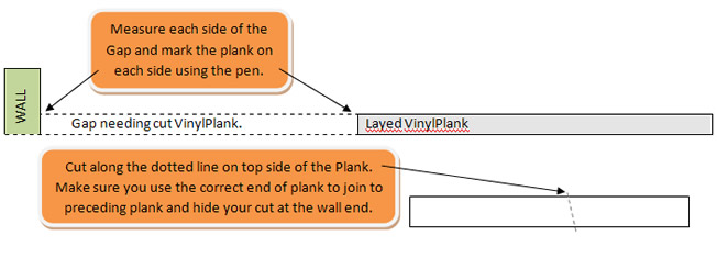 Where you need to cut your planks to fit between walls and the remaining planks, or around obstacles in the room it is best to "measure twice cut once". Remember to make sure that you take care to ensure you allow space for expansion, so always allow 5mm between the edge of the planks and any wall or obstacle. Remember that you measure the top layer of the plank only, do not include the tongue of the plank as this inserts to the preceding plank.